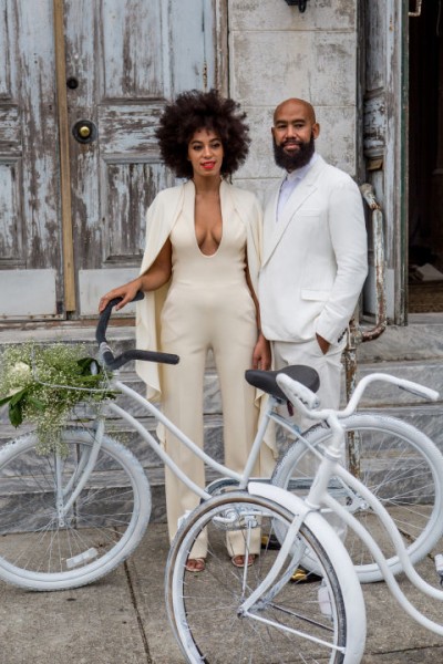 終於有褲裝啦!很多時裝界同行朋友都好想穿褲子結婚,我認為Solange Knowles這一身真的很有型,有件cape不怕凍,V Neck設計就可以show到她驕人身材,Jumpsuit看起來感覺統一,好讚啊!