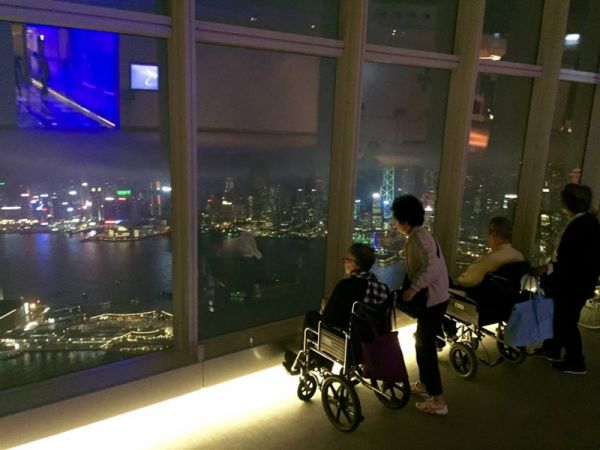 「鑽的休娛2.0」已經在四月開始,第一次出動帶了四位坐輪椅的長者和四位家屬到位於全港最高建築物環球貿易廣場頂樓的天際100,俯瞰世界聞名的香港夜景,長者們也看得入神。