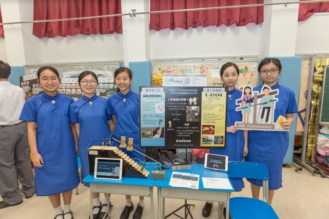 英華女學校的參賽隊伍同樣關注中西區上斜問題,並創出「Walkapanel」(樓梯導行板)及「E-steps」(壓力發電磚)。隊員謝宛珊表示,「Walkapanel的第一階段設計只能載一個人,到第二階段,我們把它變成可載兩個人;因為長者出行通常是結伴而行,這樣可令他們更有效率地一同上山!」至於E-steps,謝宛珊指設計有參考英國倫敦的例子,「E-steps可將動能轉化成電能,其產生的電量可用作Walkapanel及附近樓梯的燈使用。既然倫敦都做得到,香港為何做不到?我們又希望鼓勵年輕人多行樓梯,加強年輕一代與年長一代聯繫,為社區貢獻更多。」