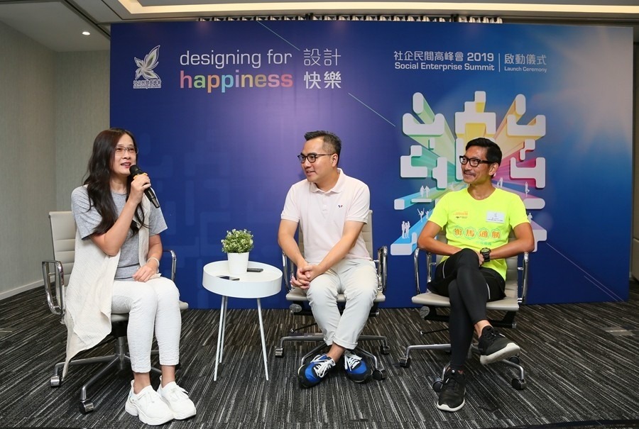 Green Monday創辦人及行政總裁楊大偉(中)、RunOurCity「全城街馬」聯合創辦人及行政總裁梁百行先生(右)、「對話體驗」常務董事朱月如女士(左)於社企民間高峰會2019啟動儀式上,以「面對挑戰 設計快樂」為題,分享自身經驗。