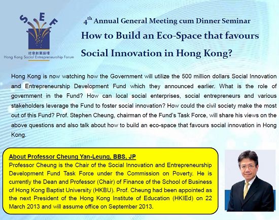 社會創業論壇將於4月24日舉行第四屆年度常務會議兼晚餐分享會,每人入場費$200(連晚餐),屆時張仁良教授以嘉賓身份分享有關社會創新和發展等話題,更會分享怎樣在香港建立對社會創新有利的空間環境。想參加的話,只要在4月19日或之前,先以支票形式交入場費,然後將收據連同你的姓名、電話號碼、機構名稱,發到指定電郵地址便可,電郵主旨請註明「Registration for the 4th Annual General Meeting cum Dinner Seminar」。
