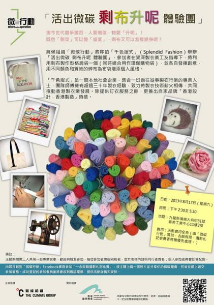 經常舉辦創意環保活動的微碳行動又舉行新的體驗團,今次微碳行動會在8月17日,帶大家到本地社會企業千色服式 Splendid Fashion,看看如何為剩布「升呢」動手製作型格環保袋一個!活動期間需要兩個人用一部衣車,所以大家可結伴報名參加這個活動。此活動費用全免,名額有限,欲報從速!