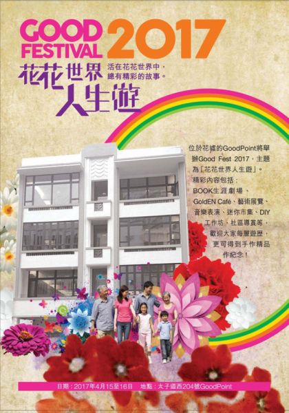 位於花墟的 GoodPoint來緊復活節將再度舉辦 Good Fest 2017,主題為「花花世界 人生遊」,不同單位以活動說出人生故事,精彩內容包括:話劇、真人圖書館、藝術展覽、音樂表演、迷你市集、DIY工作坊、社區導賞等。